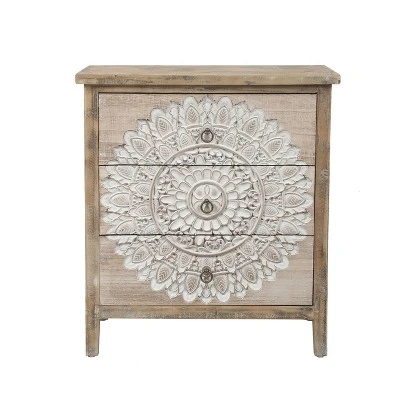 You will love the convenient storage that this accent table adds to your room with its versatile design that complements most design choices. The accent chest brings a nature feel with its weathered natural wood and carved floral front in a soft distressed white. The three wood drawers provide a stylish storage solution and give you ample space for your devices, chargers, remotes, and other essentials. Constructed of durable fir and manufactured wood, this chest is both versatile and stylish and will complement your home. The tabletop surface a smooth surface for your stylish lamp, vase, or family pictures. The sleek and stylish simplicity of this four-drawer chest lends a touch of effortless grace to your bedroom, hall, family room, or home office. With plenty of storage space and a durable construction, this chest is built to last as it enhances your decor. Specifications: Accent chest table with three wood drawers. The chest body has a weathered natural wood finish. The drawer fronts have a carved floral design in a distressed white finish. . . . . . Care: Use a microfiber cloth or a disposable electrostatic duster to remove dust. Use a paper towel or soft cloth to blot away liquid spills and condensation from drinks immediately. Wipe away the mess and immediately use a dry microfiber cloth to dry the wood and restore it back to its original finish. Specifications: Product Size: 28.19″ H x 25.19″ W x 13.25″ D Product Weight: 25.3 lbs. Drawer Dimensions: 7″ H x 21″ W x 10.13″ D Weight Capacity: 135 lbs. Product Color: Natural wood, White