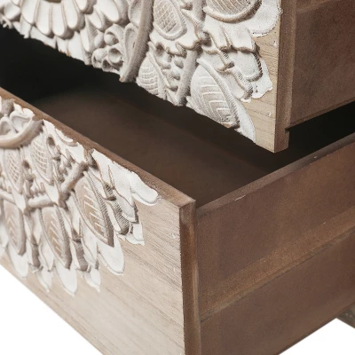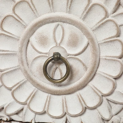 - The drawer fronts have a carved floral design in a distressed white finish that adds more charm to the chest