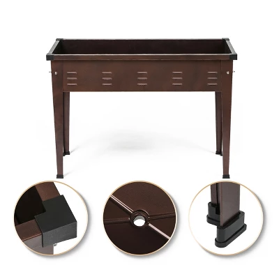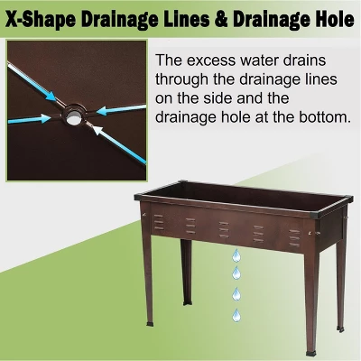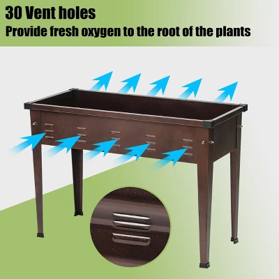 Ideal for planting flowers, plants, vegetables, or herbs, this rugged and attractive raised rectangular steel planter will make a welcome addition to any yard, garden, or patio. The raised planter height is 27.95 inches, making it easier on your back and saving your knees while you tend to your plants. Raised garden beds also have fewer weeds, and regulate water better, which makes them functional, beautiful, and practical. The planter is made from sturdy yet lightweight, powder-coated steel. The steel construction with a dark brown powder-coated finish makes the planter durable, while the rustic painted design blends in beautifully with its surroundings for a natural feel. The planter bed size is 8.07 inches high x 37.8 inches wide x 15.94 inches deep, providing plenty of planting space. Hardware included for easy assembly. Features: Reliable and durable: the raised garden bed planter is made with high-quality steel that is easy to keep clean and will have a long service life. . Resistant finish: the steel is weather, UV, frost, and rust resistant, allowing you to have a garden for every season. . Suitable for all plants: the metal planter is ideal for planting vegetables, herbs, colorful flowers, and other plants. Drainage: the plant bed includes drainage to promote healthy plant root growth without over-watering. Dimensions: Overall size: 27.95″ H x 39.57″ W x 17.72″ D Interior plant bed size: 8.07″ H x 37.8″ W x 15.94″ D Floor clearance: 20.09″ H Product weight: 19.8 lbs. Planter capacity (ounces): 1677.57..