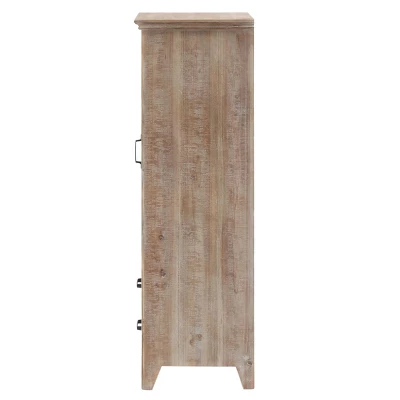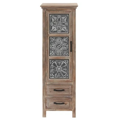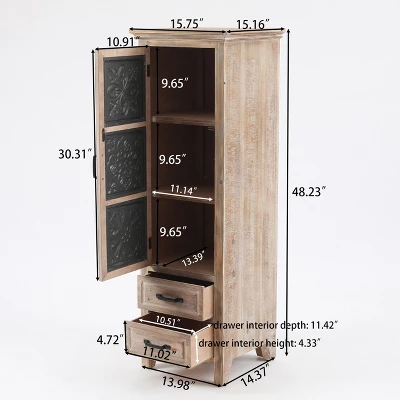 Fitted with shelves, a cabinet and two drawers, its slim design will snuggle in the tightest of spaces while still offering a spacious storage solution to your home. The rustic wood with weathered metal panels provide a shabby chic charm to any decor. This vertical storage cabinet makes a welcoming home for collectibles, bath and nursery essentials to liven up your living area. The enclosed storage area has a single door with three decorative metal stamped panels. The hidden storage has three open spaces equally divided by two shelves. In addition to the cabinet storage, this rustic piece has two pull-out drawers at the base. The crown molding at the top of the cabinet gives the cabinet a finished style that will look beautiful in your family room, dining room, bedroom, or home office. It arrives fully assembled and ready to use! Features: . . . . For indoor use – ideal for family room, bedroom, entry, hall, or dining room. . Cabinet arrives ready to use out of the box – no assembly required. . . . Care: Use a microfiber cloth or a disposable electrostatic duster to remove dust. Use a paper towel or soft cloth to blot away liquid spills and condensation from drinks immediately. Wipe away the mess and immediately use a dry microfiber cloth to dry the wood and restore it back to its original finish. Specifications: Cabinet size: 48.23″ H x 15.75″ W x 15.16″ D (Base of the cabinet: 13.98″ W x 14.37″ D) Product Weight: 29.1 lbs. Drawer Dimensions: 4.33″ H x 10.51″ W x 11.42″ D Drawer Weight Capacity: 11 lbs. Shelf Dimensions: 9.65″ H x 11.14″ W x 13.39″ D Shelf Weight Capacity: 11 lbs. Weight Capacity: 150 lbs. Product Color: Brown, Gray