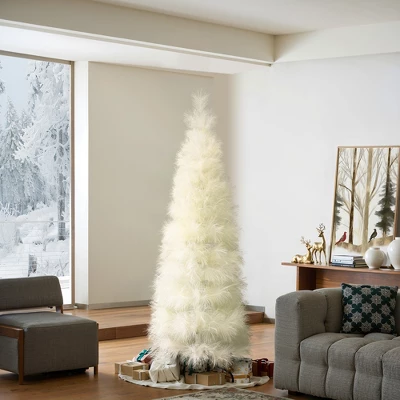 Infuse your space with a lively and artistic atmosphere this holiday season! This 6-foot artistic Christmas tree features a unique fluffy pampas grass design, offering a soft and natural touch to your decorations. Crafted from high-quality polyester, it beautifully mimics the elegant and elongated shape of real pampas grass. The tree’s two-section structure and wrapped branch design make installation easy and efficient. Simply fluff the branches and leaves to reveal a stunning Christmas tree that exudes artistic flair! The sturdy metal stand ensures the tree remains stable. Whether in the corner of your living room, office, classroom, or commercial space, this unconventional Christmas tree serves as a captivating natural art installation..