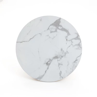This round side table, with its unique design and high-quality materials, brings a touch of elegance and practicality to your home space. The tabletop is crafted from manufactured wood with a faux marble design, which is not only aesthetically pleasing but also easy to clean and maintain. Supporting the tabletop are three cylindrical legs with burl textures, whose unique patterns add a natural and primitive aesthetic. These legs not only provide stable support but also add a distinctive style to the side table. The selected MDF material ensures the durability and stability of the side table, making it an ideal choice for indoor decoration. Whether placed in the living room, bedroom, or office, this side table can easily blend into various decorative styles, adding a sense of modernity and comfort to your space.