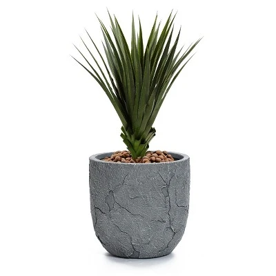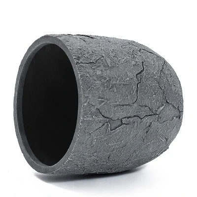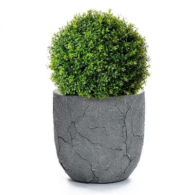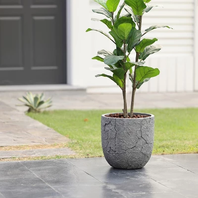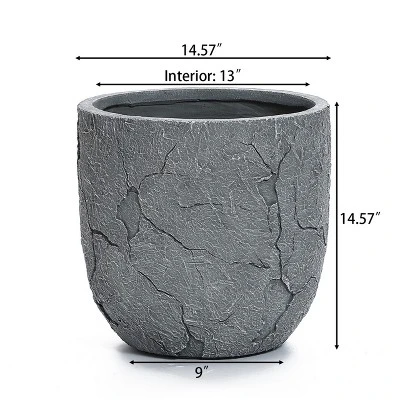 - The planter has a stone-gray finish with a crackle design that gives it an old-world charm