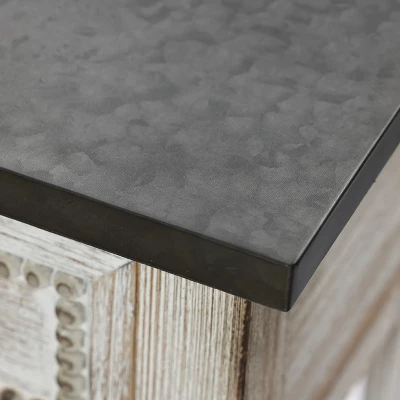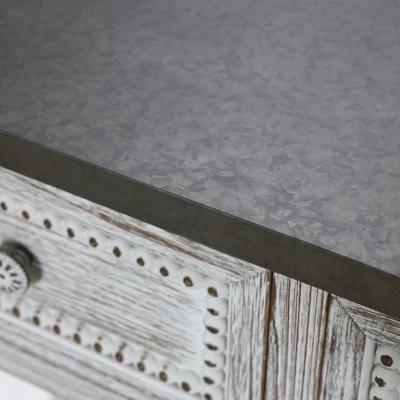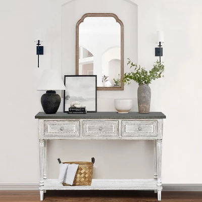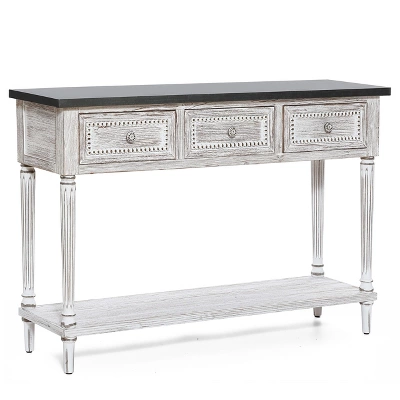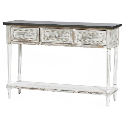 Store and showcase your favorite things with the farmhouse-inspired console and sofa table. Its mixture of distressed white and whitewashed finishing creates a vintage two-tone look that will endure for years. The table top is wrapped in a galvanized iron sheet to resist rust and make it easy to clean. Unlike shiny stainless steel tabletops, this galvanized metal tabletop will provide a warm, rustic feeling to your home ambiance and match perfectly with most decor. If you need more storage, this table is the perfect solution with its three drawers and open shelf ideal for more oversized items. Place the console table against a wall to add a finished look to the living room, entryway, or hallway walls. This is the perfect spot to display your family photos, cherished collectibles, or decorative items. This table can be an attractive option as a small server or bar in the dining room if you donโt have enough space for a typical server.