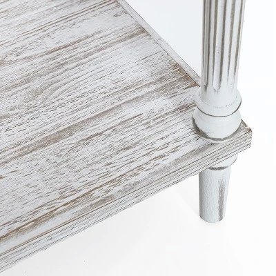 - Console body and legs are made of fir and manufactured wood and features in a distressed white finish