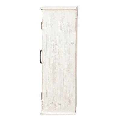 - Wall cabinet is constructed using manufactured wood with a distressed white finish