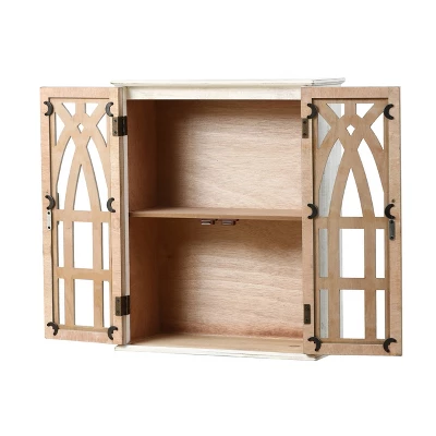 Add a vintage farmhouse flair with this unique hanging wall shelf, a rustic distressed white cabinet body, and a double-door cabinet enclosure. The two natural wood-finished doors with glass insets feature a cathedral-inspired design that gives the cabinet a traditional feel. Designed with smaller spaces in mind, this hanging cabinet will organize spaces if you only have a bit of wall space but still want smart storage. It will work exceptionally well in an entryway, mudroom, kitchen, half-bathroom, living room, or guest room. The hanging cabinet is divided horizontally by a single fixed shelf. Two metal keyhole bracket hangers are inset on the back of the cabinet for an easy and secure wall display. Features: The wall cabinet features two doors opening to ample storage space. The . Cathedral-style doors with distressed natural wood finish. . The . Creative wall storage solution for an entryway, mudroom, kitchen, half-bathroom, living room, or guest room. Wall cabinet storage is ideal for adding storage without taking away from your floor space. The . Care: Clean with a soft cloth. Do not use harsh chemicals to clean. Product care: wipe with a dry or damp cloth. Use a clean dry cloth to remove moisture that could cause the wood to warp. The wall cabinet is not moisture or water-resistant. Cabinet Specifications: Product Size: 23.6″ H x 18.9″ W x 8.3″ D Shelf size: 11″ H x 17.25″ W x 6.5″ D Product Weight: 16.9 lbs.