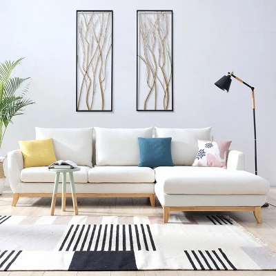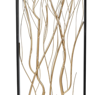 - Contemporary metal wall sculpture set includes two framed panels with interwoven gold branches