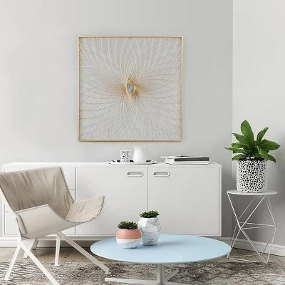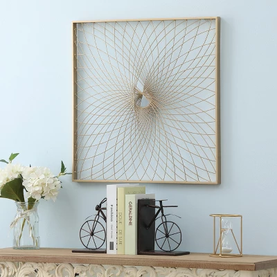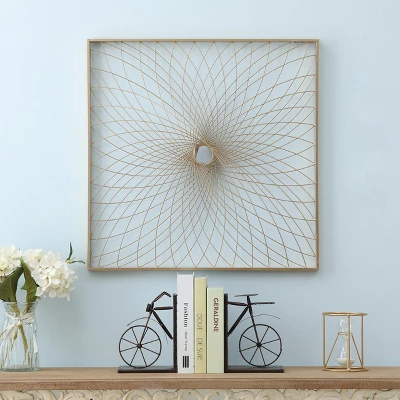 This abstract floral metal wall decor makes a statement in any home. The handcrafted piece is constructed of iron in a soft gold-tone finish. It features a square frame around an open design made of a series of curved, spiraling lines, creating a flower shape. The metal flower sculpture has an abstract type design that is unique, and adds elegance to your interior decor. It is an eye-catching decoration to any wall in your home. It is lightweight but sturdy enough, and can be hung alone or with other home wall art. This piece comes with wall-mounting hardware, so itโs easy to hang.