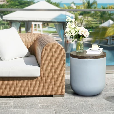 Look no further than this contemporary-style round side table for beauty and a minimalistic design. The soft gray finish with its rich dark brown faux wood tabletop allows it to blend with and complement a variety of color schemes and styles. Plus, it is small enough that it won’t overwhelm tight spaces. Perfect as a place for your plant to rest or an eye-catching end table for your indoor or outdoor ensemble. With its tapered silhouette, the round table is made with lightweight and high-quality magnesium oxide material and arrives ready to use. This contemporary piece is a seamless addition to any space, whether you add it to your patio furniture or place it next to your sofa.