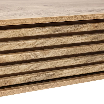 Introducing a coffee table that is more than just a functional piece of furniture. This sleek and elegant design is crafted to infuse your space with style and sophistication. The slatted sliding doors offer a glimpse into the dual-side storage, providing an uncluttered space to store your essentials. Ideal for contemporary apartments and intimate family homes, this coffee table is the perfect centerpiece for your gathering area. With ample surface space, sturdy foundation, and a design that is sure to impress, it is perfect for showcasing your favorite books, decorative items, or even your morning cup of coffee. Get ready to elevate your space with this must-have coffee table.