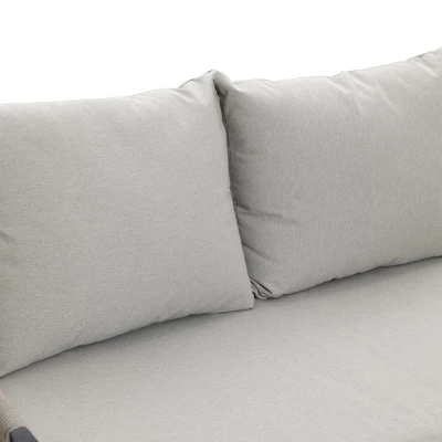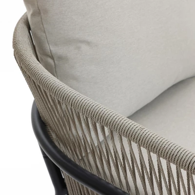 This outdoor aluminum with PE rope loveseat sofa set, with its excellent durability and elegant design, brings a perfect combination of comfort and aesthetics to your outdoor space. The sofa features a sturdy aluminum alloy frame and PE rope material, which can withstand harsh weather conditions and is corrosion-resistant, ensuring long-lasting use. The included coffee table is also made of aluminum alloy, with a finely brushed paint finish that complements the sofa perfectly. The KD (knock-down) design allows for a simple and quick assembly process, which can be easily completed without the need for professional tools. The soft cushions provide additional comfort, making this sofa set ideal for family gatherings or personal relaxation. Moreover, the coffee table is practical and adds convenience to your outdoor living. The overall design is simple yet modern, able to blend with various outdoor decorative styles, making it the best choice to enhance the quality of your outdoor life..