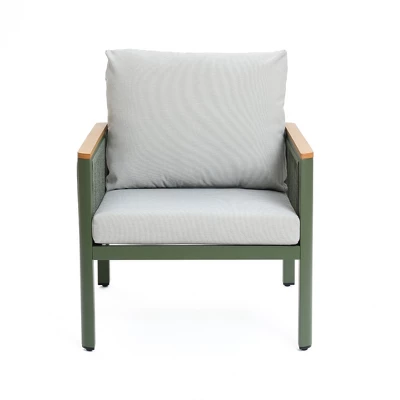 This outdoor aluminum armchair set, which includes two single chairs, is an ideal choice for your leisure space. The chairs feature a sturdy aluminum alloy frame, ensuring durability and stability in various weather conditions. The armrests are made from plastic, which offers a natural wood texture along with UV resistance and waterproof properties, making them easy to clean and maintain. Each chair comes with a 9 cm thick high-density foam cushion and backrest, covered with at least 220 grams of high-quality fabric for both comfort and durability. The simple and modern design allows these chairs to seamlessly blend into various outdoor decor styles, adding a touch of fashion and comfort to your patio, deck, or garden.
