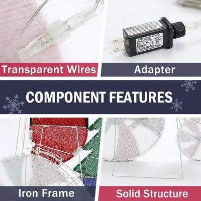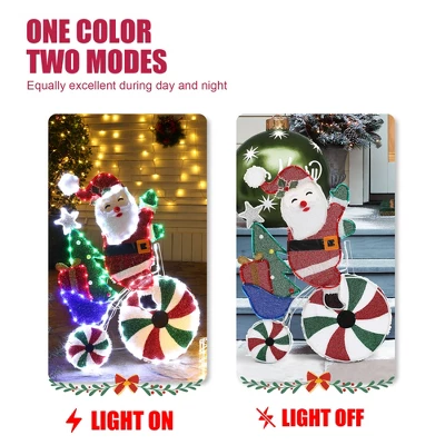 This delightful holiday decoration showcases Santa on a peppermint-colored bicycle, merrily distributing gifts, with a splendid Christmas tree atop the bike. Not only is it an excellent addition to your exterior embellishments, but it can also be displayed indoors, nestled comfortably beside your Christmas tree. The warm LED lights outline the decoration lending it a glittering and dazzling effect. Moreover, it is crafted using fabric enveloped around a sturdy iron frame, ensuring its longevity. Revel in this joyous decoration throughout the festive season!