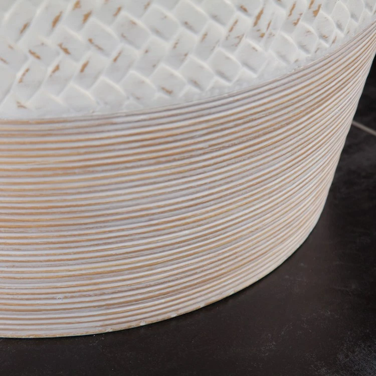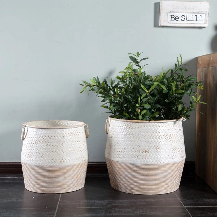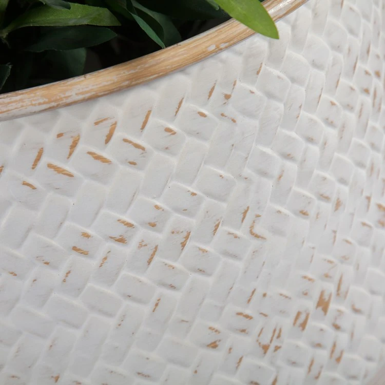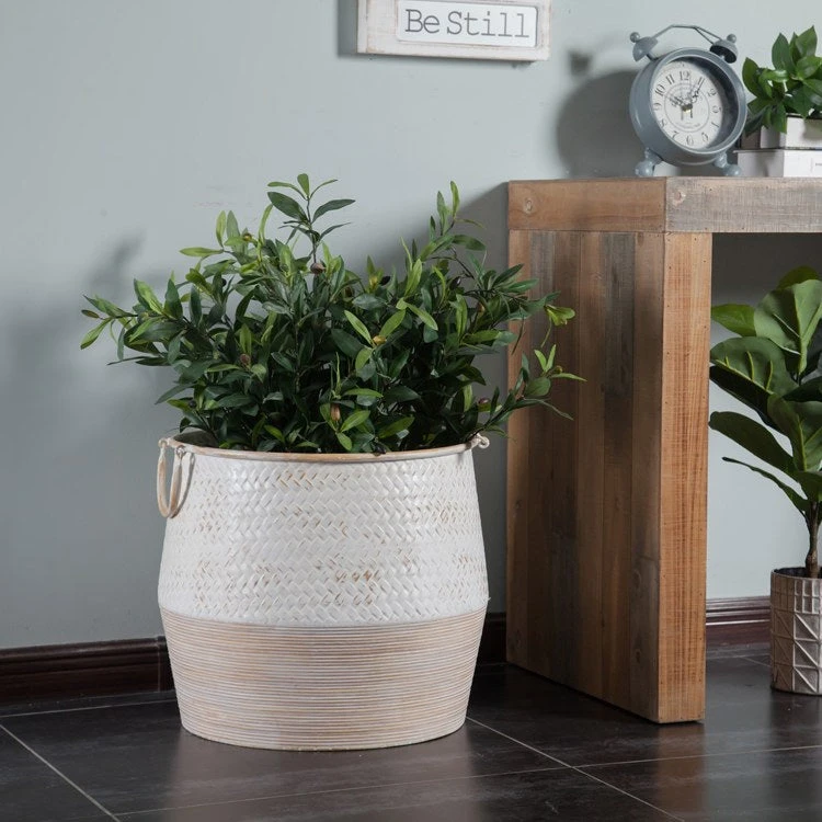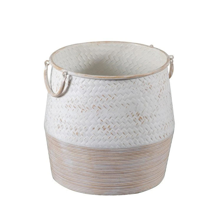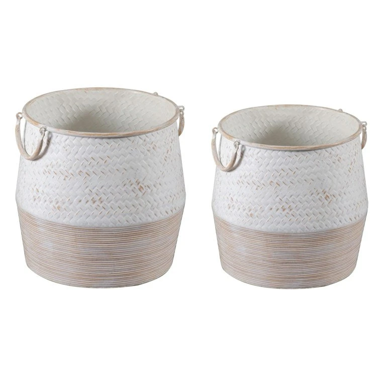 This lovely vase set is handcrafted in iron, and features soft tones of distressed white on top, and tan on bottom. The shabby-chic metal vases have a rustic finish and are the perfect accent piece for any decor. The set includes two vases are identical in style, but not in size. The large vase is 15.75″ H, and the medium vase is 14.25″ H.